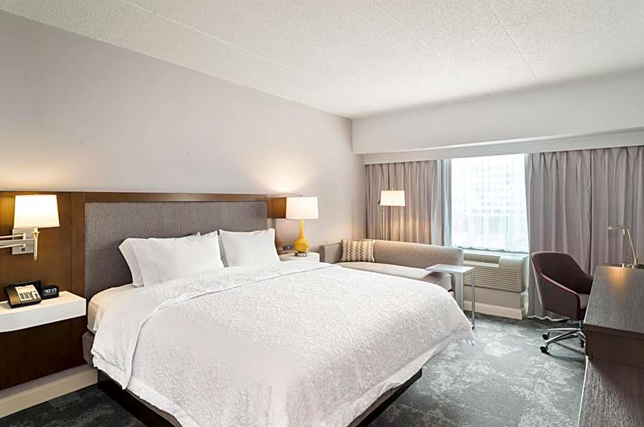 This suite features an accessible bath tub, flat-screen TV and work desk.