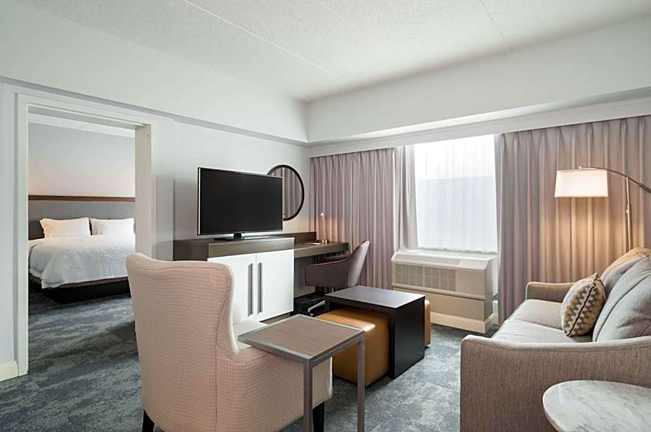 This suite features an accessible bath tub, flat-screen TV and work desk.